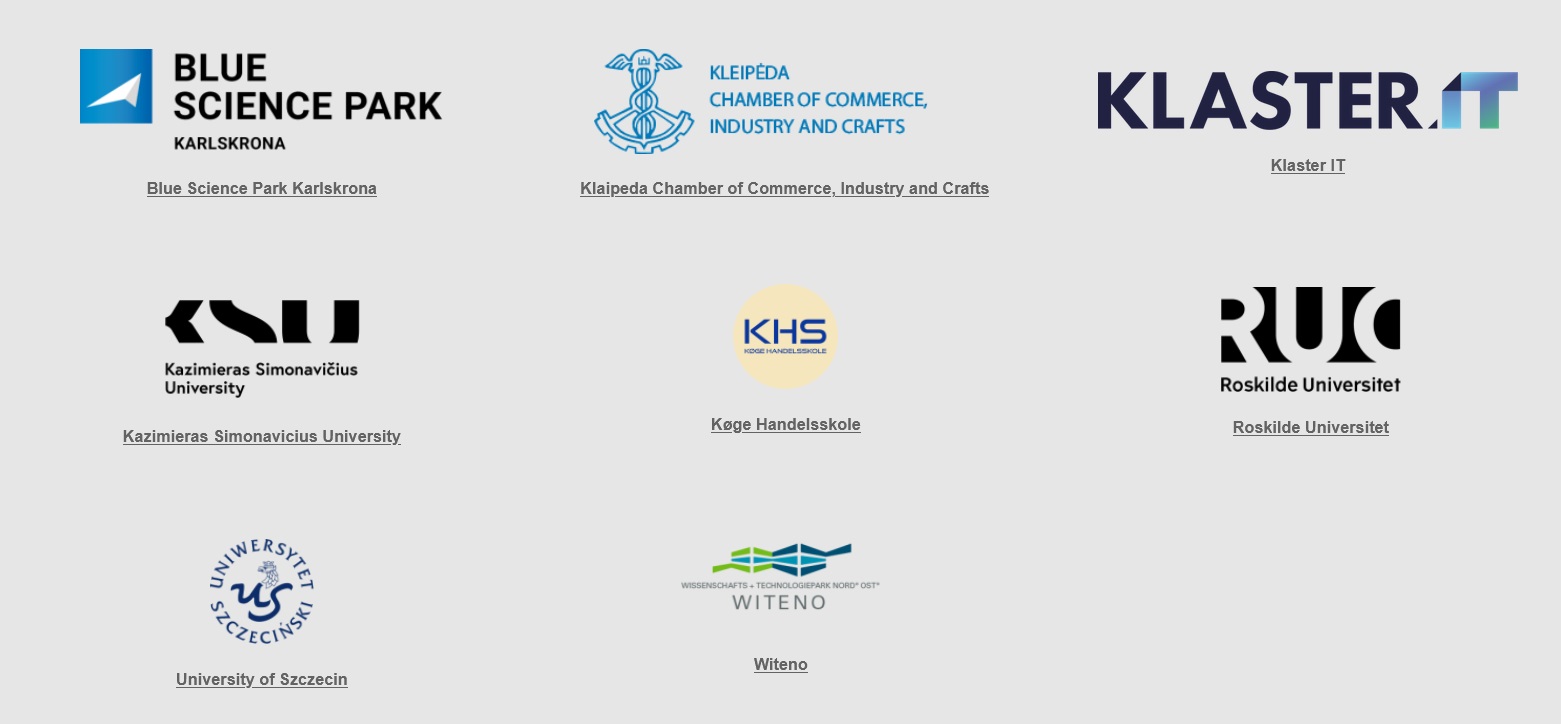 Partnerami projektu są 3 uniwersytety, 3 parki technologiczne, 1 szkoła biznesu i 1 izba handlowa. W projekcie bierze udział 8 partnerów: z Danii (2), Niemiec (1), Litwy (2), Polski (2) i Szwecji (1). Projekt wspiera 12 partnerów stowarzyszonych, którymi są władze regionalne, organizacje otoczenia biznesu oraz instytucje edukacyjne z Danii, Niemiec, Litwy i Szwecji. Projekt jest prowadzony przez Uniwersytet Roskilde, Wydział Nauk Społecznych i Biznesu.