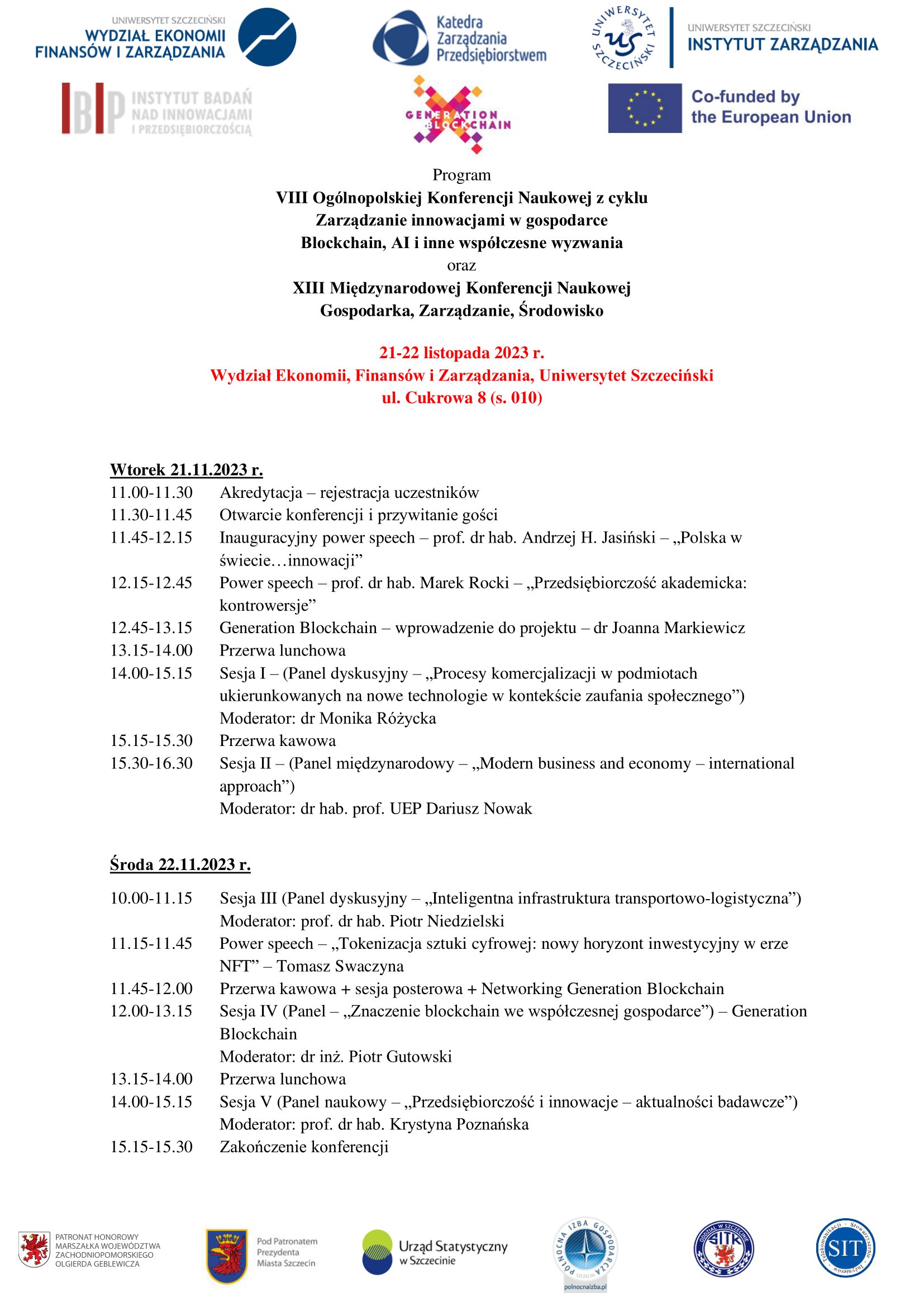 W dniach 21-22 listopada 2023 r. na Wydziale Ekonomii Finansów i Zarządzania Uniwersytetu Szczecińskiego odbywają się 2 konferencje – VIII Ogólnopolska Konferencja Naukowa z cyklu „Zarządzanie innowacjami w gospodarce” oraz XIII Międzynarodowa Konferencja Naukowa „Gospodarka, Zarządzanie, Środowisko”.